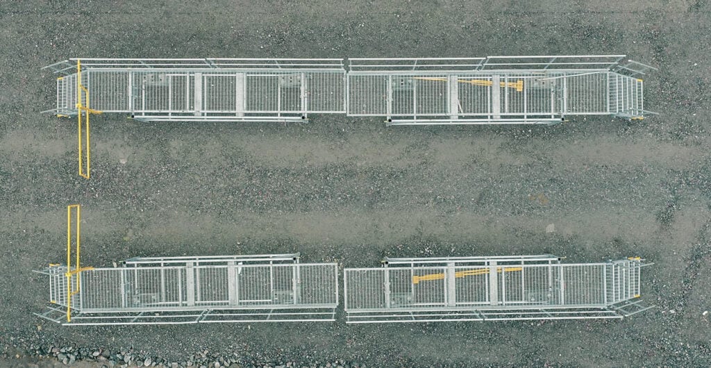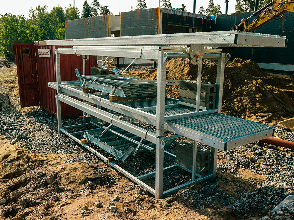 Elementtipurkutelineen kuljetus on helppoa, kun porras ja kaiteet sijoitetaan telineen alle kuljetuksen ajaksi, ja neljä varusteineen koottua moduulia mahtuu 6 metriä pitkälle lavalle.