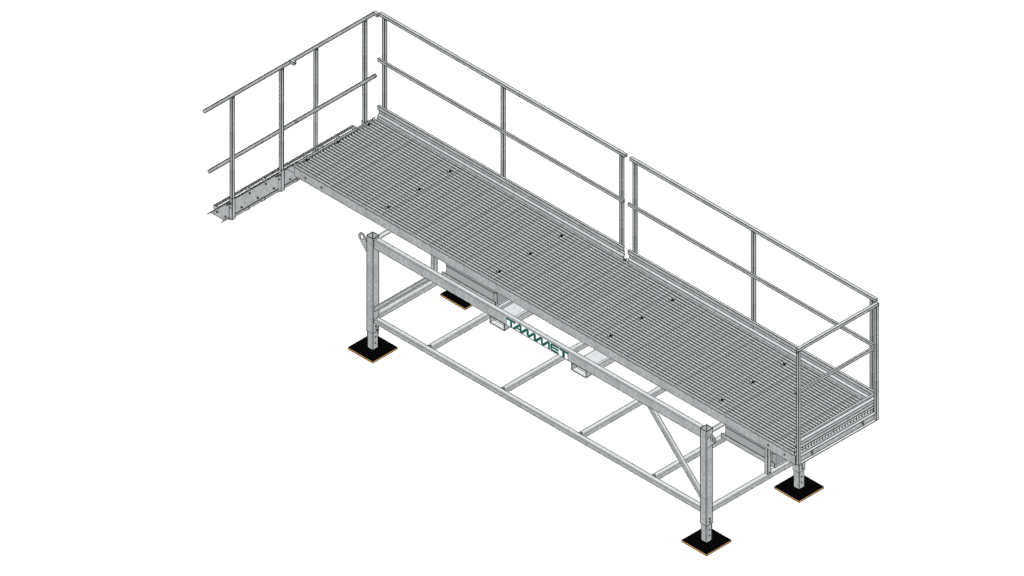Telineen molempiin päihin voidaan asentaa portaat, ja pitkille sivuille integroidut turvakaiteet kuuluvat vakiovarustukseen. Neljällä moduulilla voidaan muodostaa koko ajoneuvoyhdistelmän mittainen purkupaikka, mikä lisää joustavuutta työmaan tarpeiden mukaan.